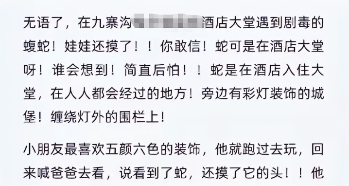 这次事件发生后,九寨沟联系部门迅速行径,公安部门调取监控、斟酌旅客,最终详情不是有东谈主有益把蛇放进去的。