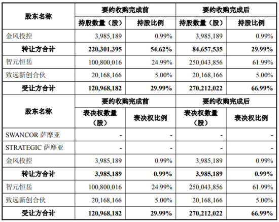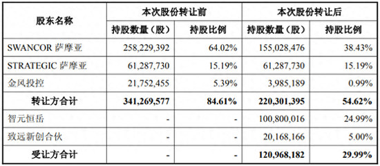 持股平台致远新创合伙从SWANCOR萨摩亚受让240.09万股,占股0.6%;从金风投控受让1776.73万股,占股4.40%。