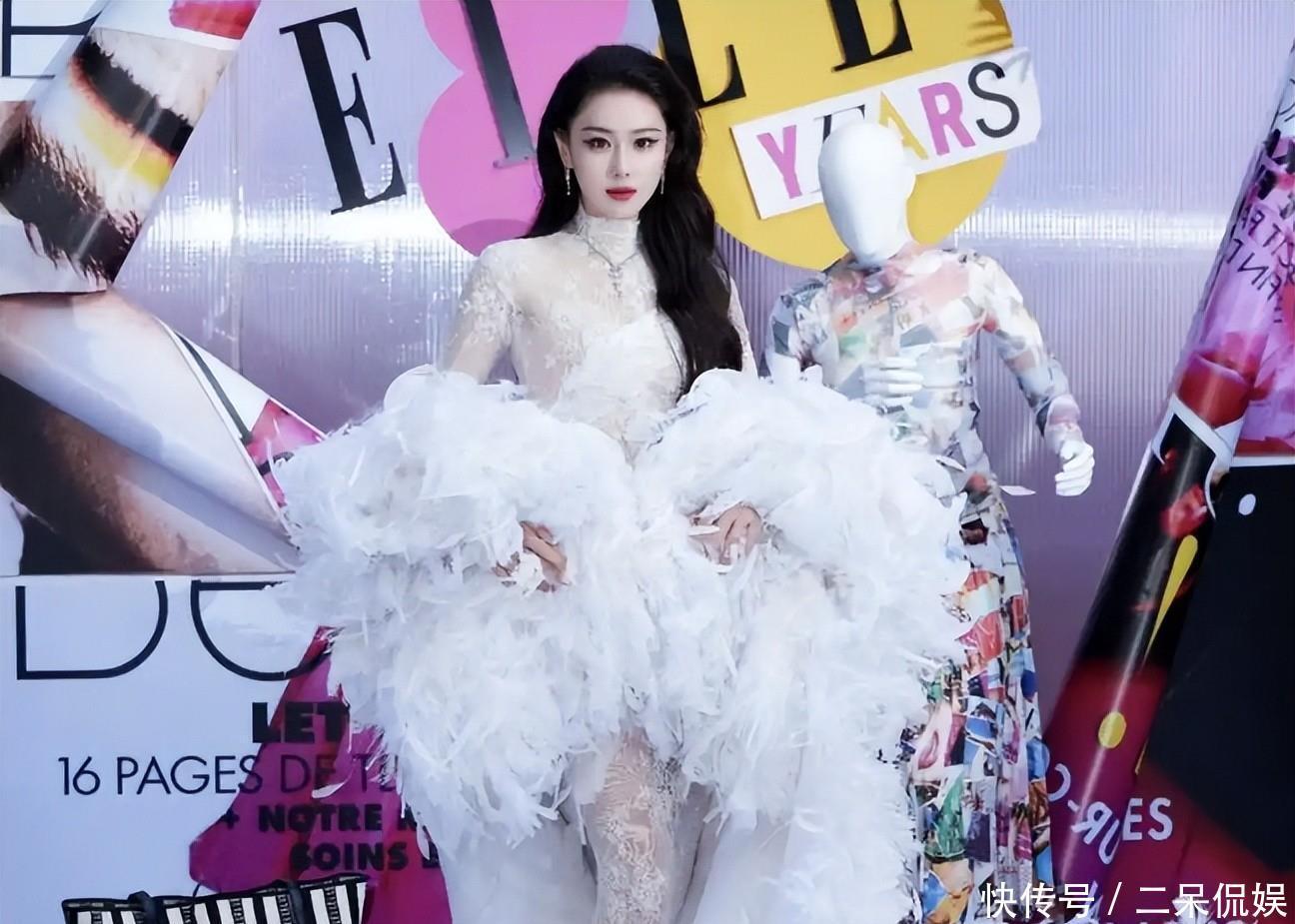 张馨予身穿百色蕾丝长裙献身舞台,死后拖着长达三米高羽毛披肩,通盘东说念主的视野都被她引诱。
