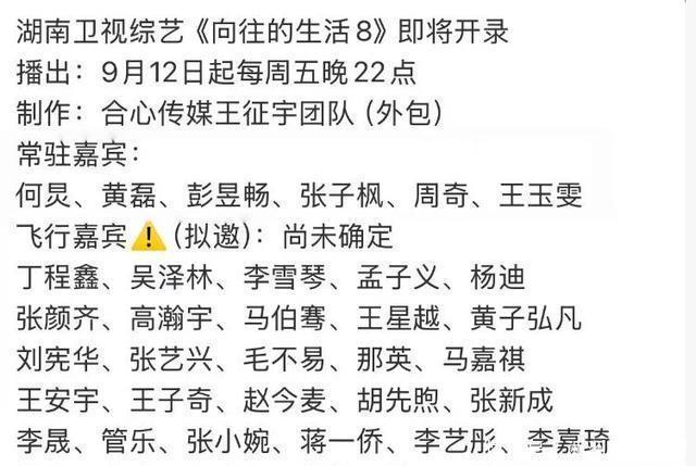 搜狐文娱专稿(胖部/文) 停播两年之后,《向往的生计》第八季宣告行将纪念。 初度传出详情重启的音问是在芒果台招商会上,何炅和黄磊亲身通知节目纪念,还通知将召集“原班东说念主马”,彼时传出的六位拟邀常驻嘉宾,分裂是何炅、黄磊、彭昱畅、张子枫、刘宪华以及张艺兴。 而凭据近期运转录制的音问,本季常驻声势基本详情的是何炅、黄磊、彭昱畅、张子枫这四位伴随节目最久的声势,节目有望在8月底运转录制。 还有音问暗示,演员周奇和王玉雯或成为节目常驻。归拢音问源附带的航行嘉宾名单,包括丁程鑫、刘宪华、白鹿、毛不易、马嘉祺等近20东说念主;丁程鑫有可能参加《向往的生计8》以致登上热搜,如斯热度也可见这一综艺IP的影响力。