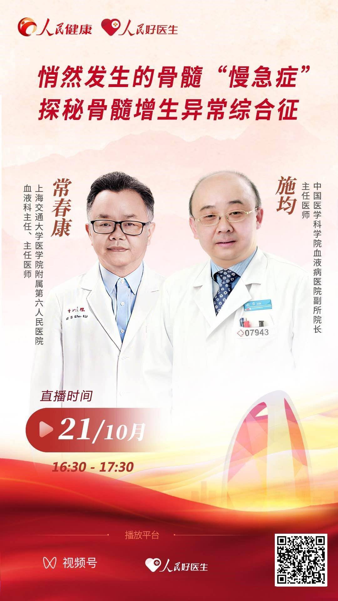 10月21日16:30至17:30,在骨髓增生相等概括征全国警悟日(MDS日)行将莅临之际,中国医学科学院血液病病院副所院长、主任医师施均,上海交通大学医学院从属第六东说念主民病院血液科主任、主任医师常春康将作客直播间,围绕骨髓增生相等概括征的疾病气象、诊疗痛点、手脚调养以及翻新调养施展等热门话题进行共享。迎接届时收看。